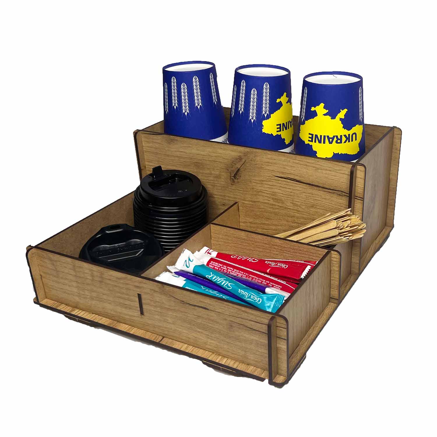 Органайзер-подставка для стаканчиков кофе, салфеток, трубочек и стиков сахара 4 отделения дуб