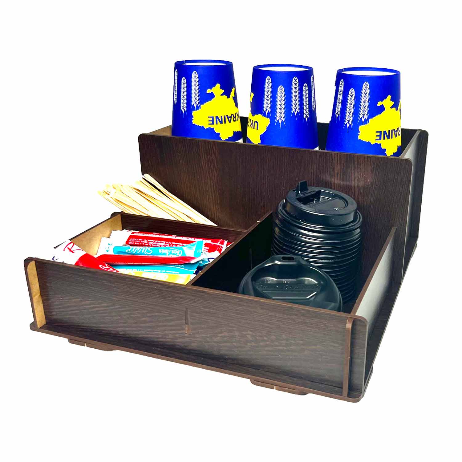 Органайзер-подставка для стаканчиков кофе, салфеток, трубочек и стиков сахара (7 отделений, венге)Фу..