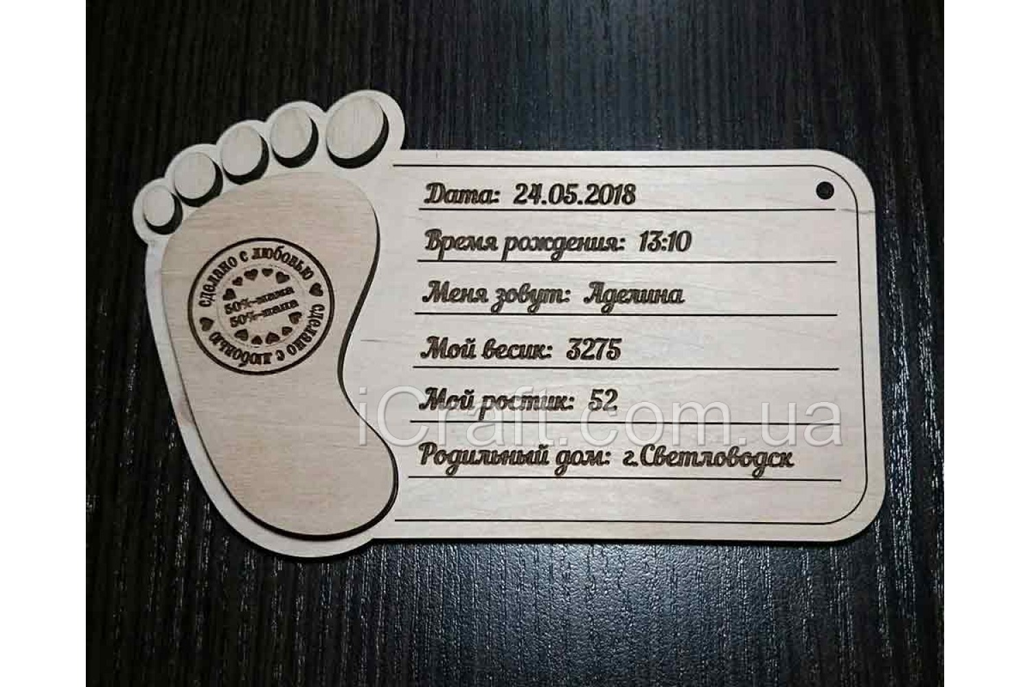 Метрика ніжка іменна, розмір 15*10см. без покриття. Матеріал – екологічно чиста фанера.